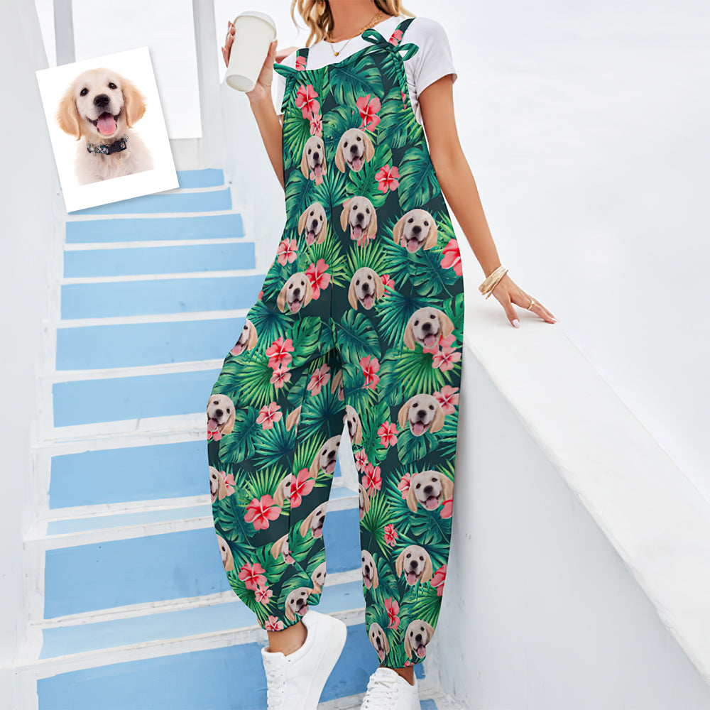 Custom Face Jumpsuit With Suspender Hawaiian Style Leaves & Flowers Rompers