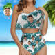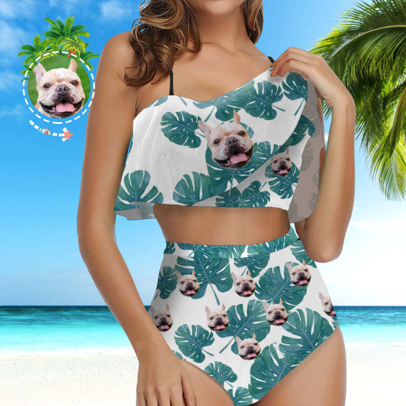 Custom Bikini with Face Swimsuit with Dog Face Ruffle Bikini with Face High Waisted - Green Leaves