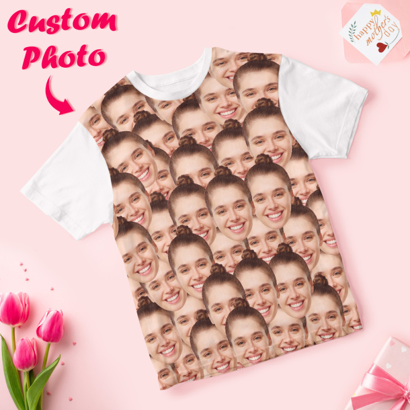 This custom photo t-shirt features your uploaded face printed repeatedly across the entire front of the shirt – perfect for birthdays, anniversaries, Mother's Day, or just for laughs.